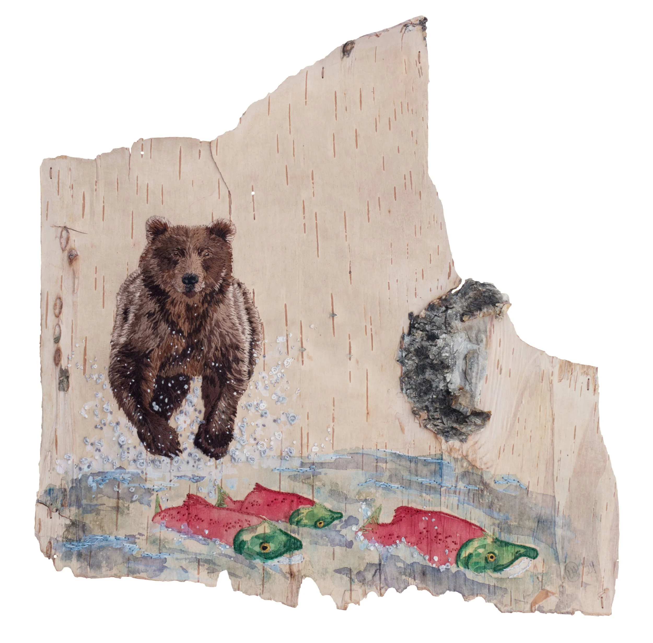 All pieces are first painted using handmade watercolors directly onto the birch bark. Then, I use modern hand embroidery techniques to add texture and details to the piece.