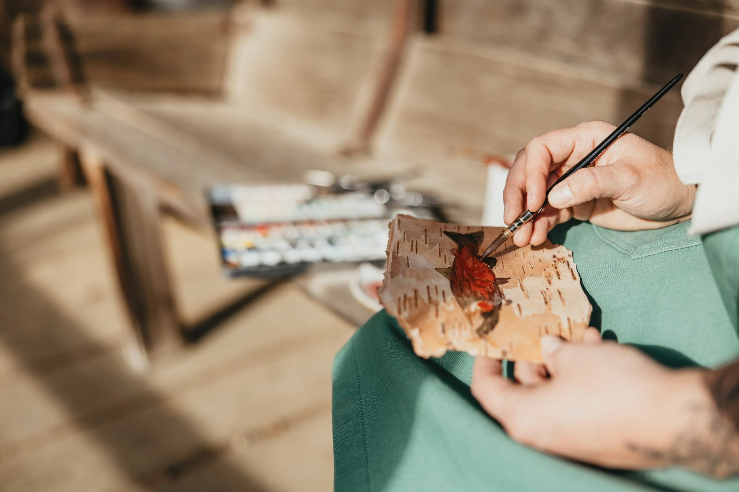 All pieces are first painted using handmade watercolors directly onto the birch bark. Then, I use modern hand embroidery techniques to add texture and details to the piece.