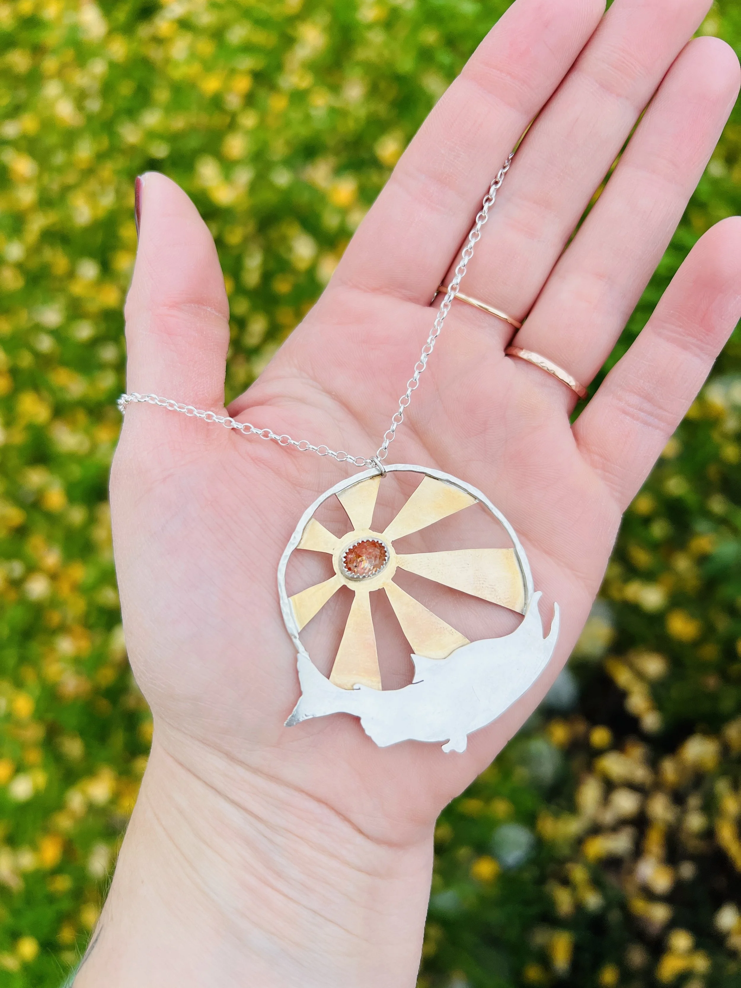 This necklace is crafted from .925 sterling silver and jeweler's brass. A little extra bling on this one from the stunning confetti sunstone! .925 sterling silver chain is 20"