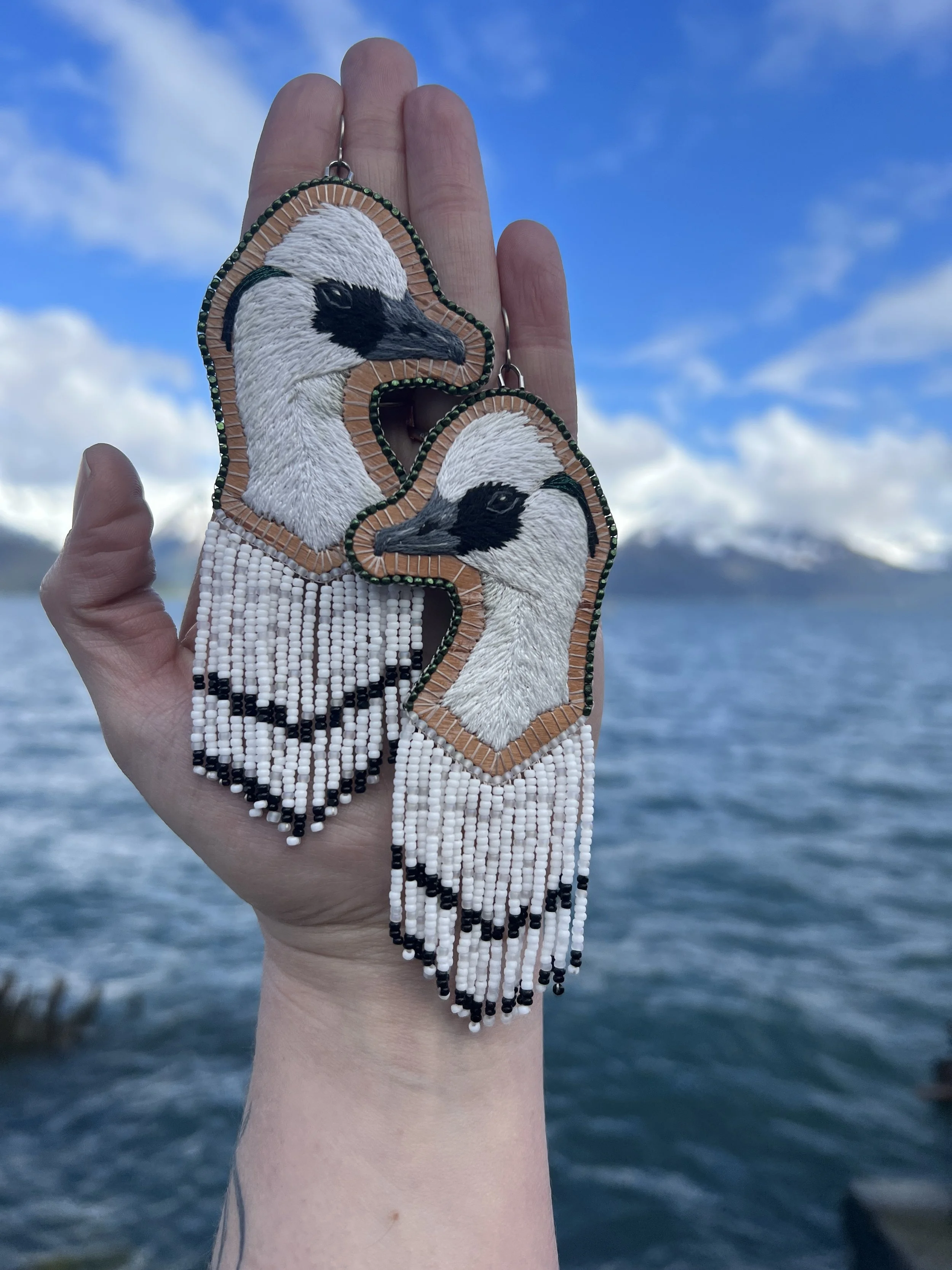 These delightful smew (a super cool sea duck!) were hand embroidered directly onto birch tree bark and backed with hand tanned salmon leather. They are finished with a Miyuki glass bead fringe designed to mimic the coloration of the bead. Findings are hypoallergenic titanium.