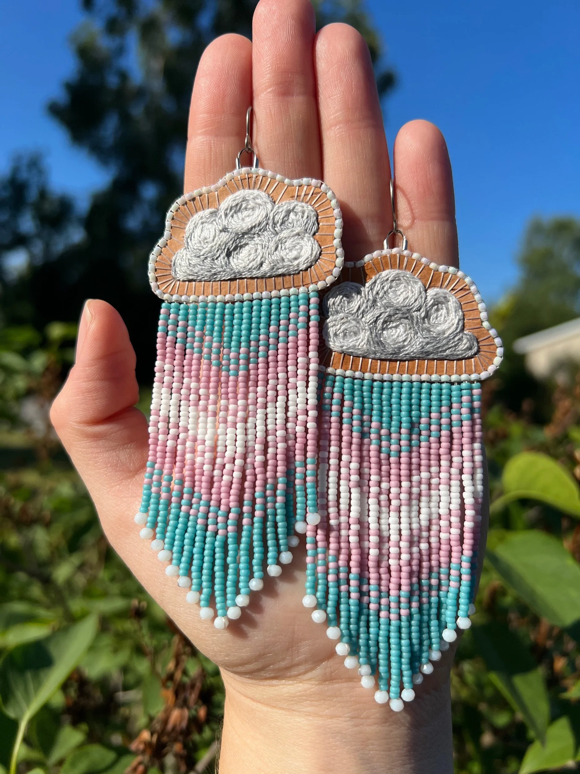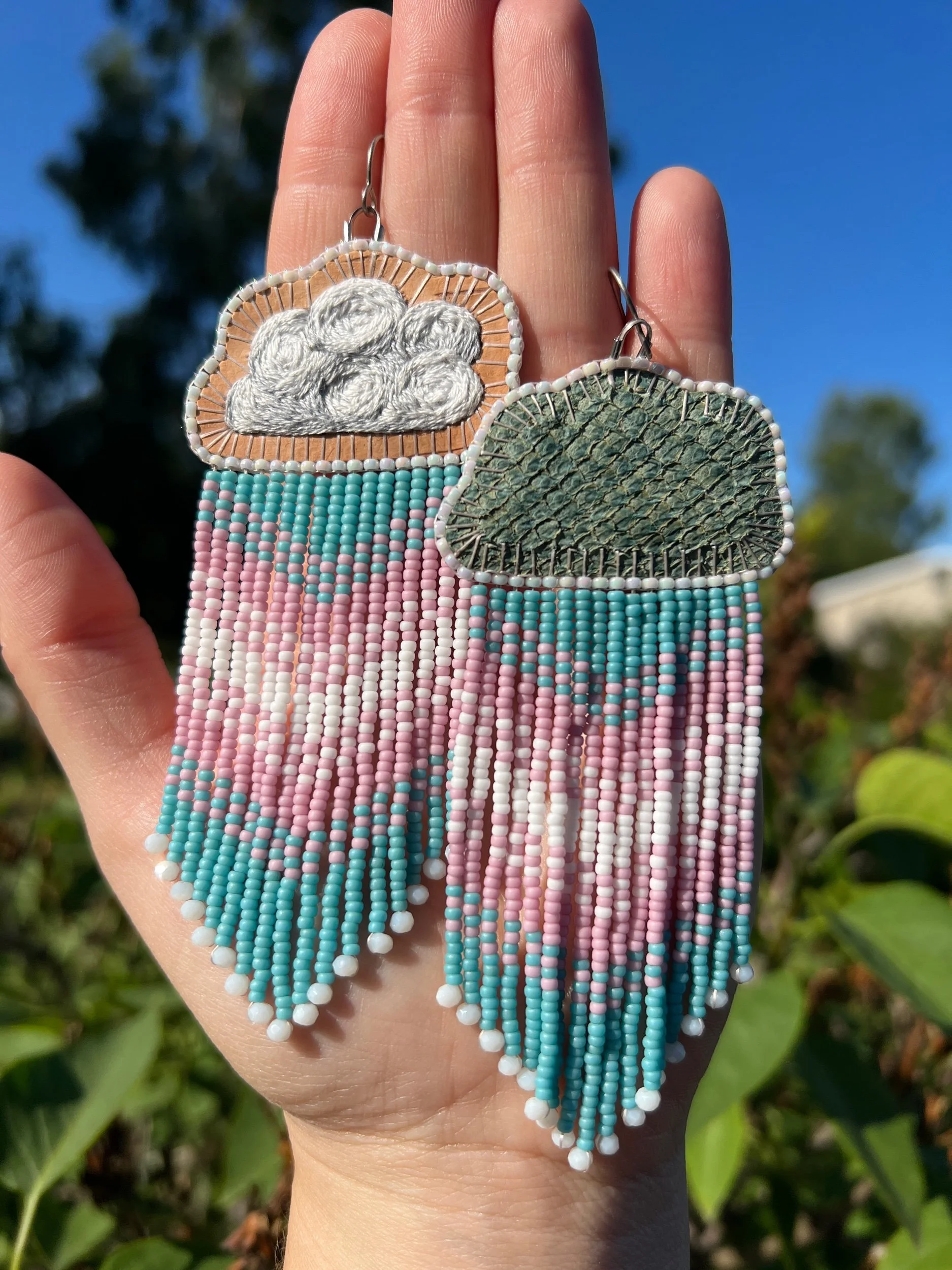 The clouds on these are hand embroidered onto birch tree bark and backed with indigo dyed hand tanned salmon leather. The fringe is made from Miyuki rondelles and findings are hypoallergenic titanium.